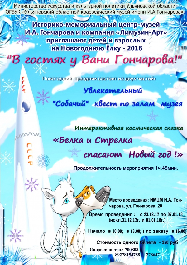 Затем в Торжественном зале музея начнётся увлекательное интерактивное театрализованное представление «Белка и Стрелка спасают Новый год!». Ваня Гончаров вместе с Белкой и Стрелкой и всеми ребятами полетят на межгалактической ракете «Паллада» навстречу нелёгким испытаниям, чтобы общими усилиями спасти Новый год.